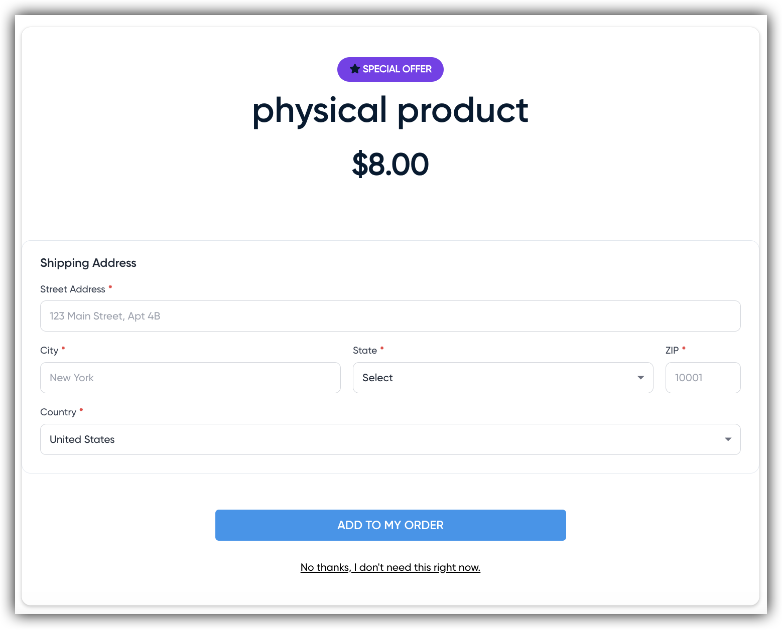 When a shipping address is needed, customers see a simple address form on the upsell page before the purchase button. They enter their shipping details, then complete their purchase.