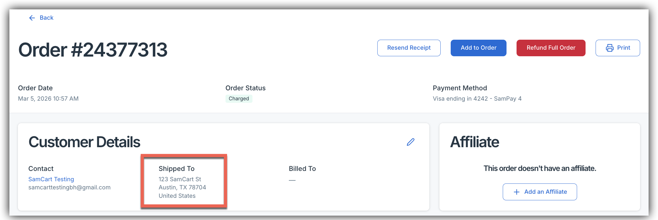 In Order Details: The shipping address appears in your dashboard under the order, displayed under the Shipped To section in Customer Details.