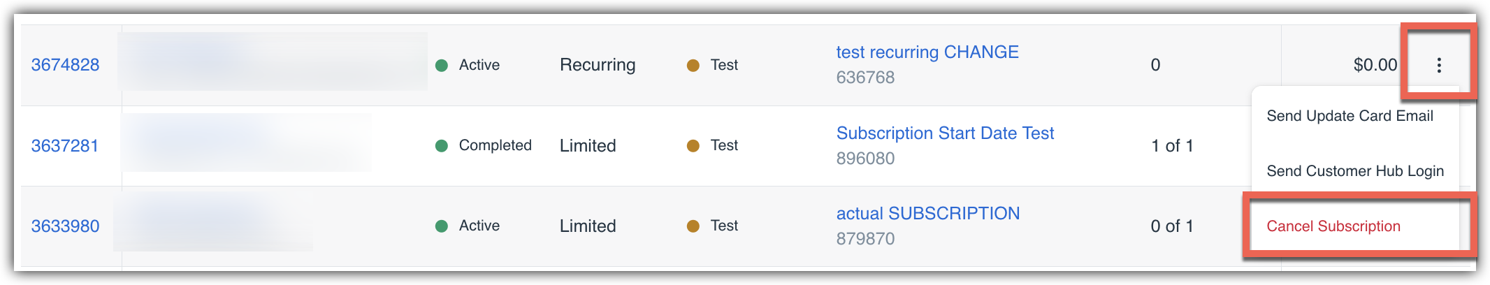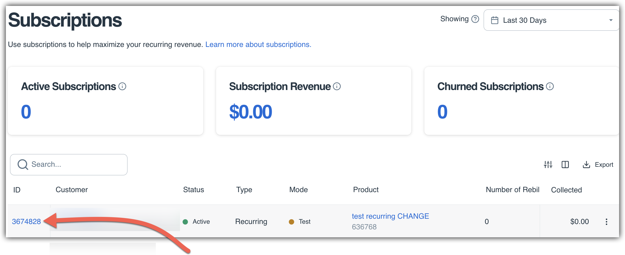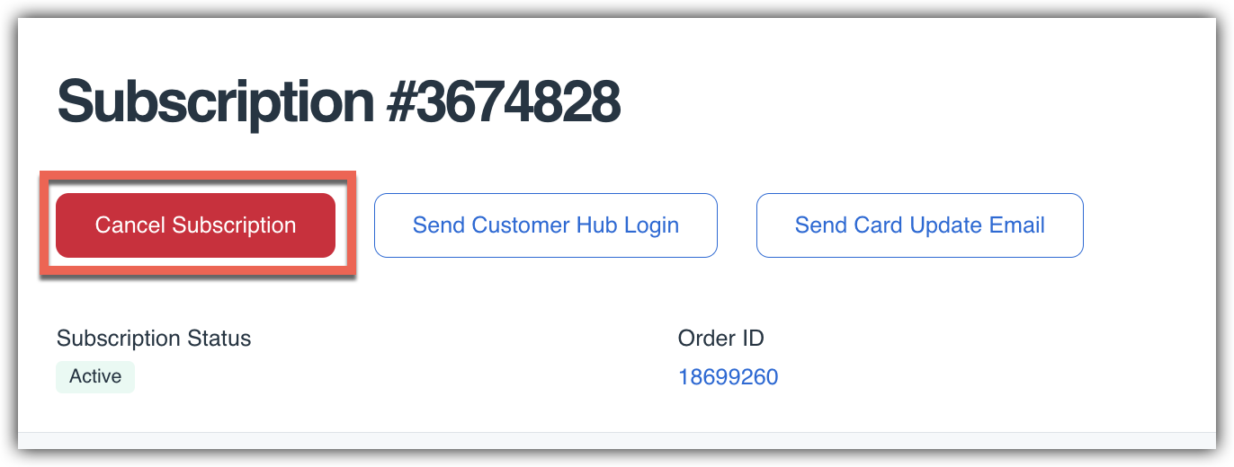 You can also cancel your customer's subscription from within their subscription page! To do this, click on the subscription ID for the subscription you would like to cancel on your Subscriptions page.