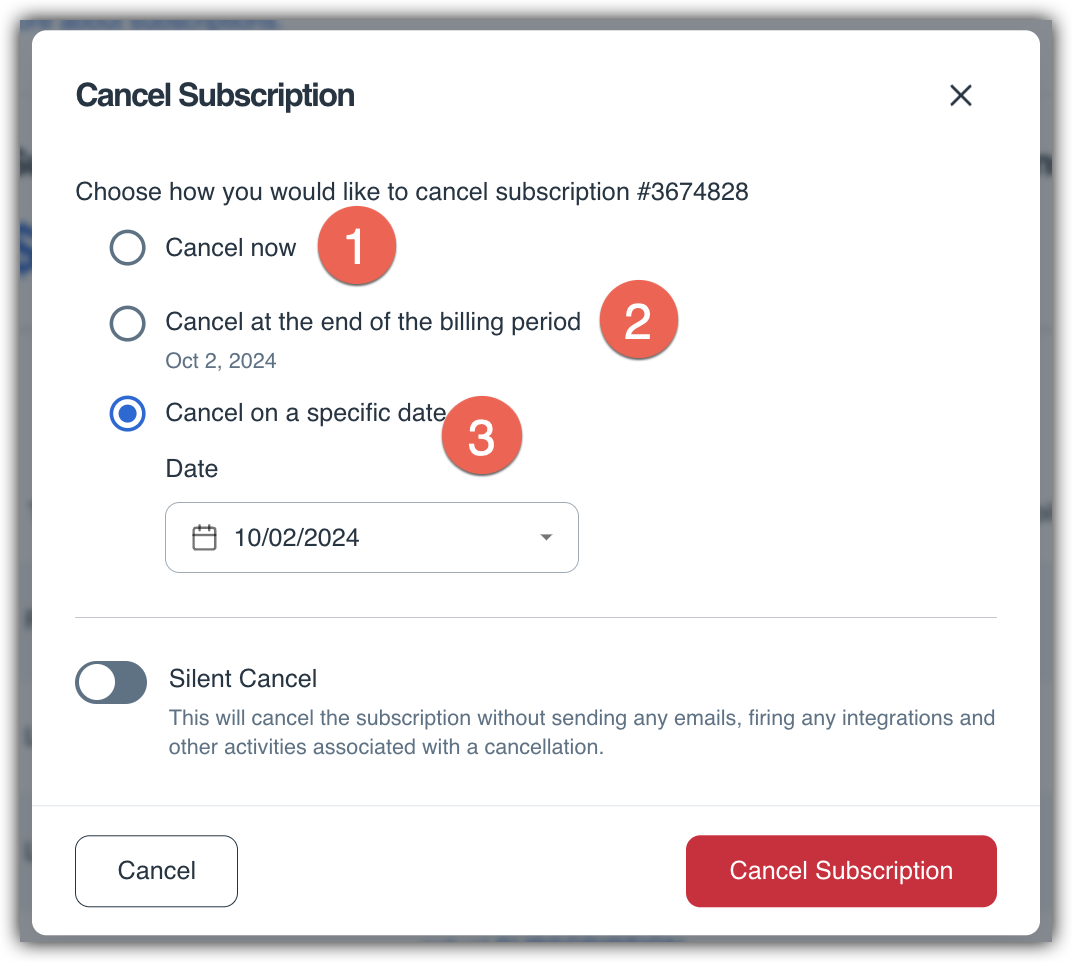 This will bring up a Cancel Subscription pop up. From here, you have three options for a cancellation - Cancel now (1), Cancel at the end of the billing period (2) or Cancel on a specific date (3). Cancel now will immediately cancel the subscription. Cancelling at the end of the billing period will keep the subscription active until the next billing date, at which point the subscription will cancel so the customer will not be charged again. Cancelling on a specific date will cancel the subscription on the Date specified, and any charges that are scheduled to occur prior to that date will occur as normal.