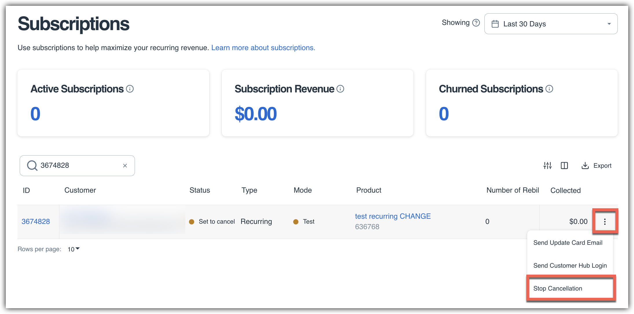 If you would like to undo a scheduled cancellation, you can do this with our quick actions as well! From the Subscriptions page, locate the subscription you would like to undo a cancellation for. Click on the three dots to the right of the subscription to pull up the quick actions menu, and click the Stop Cancellation button.