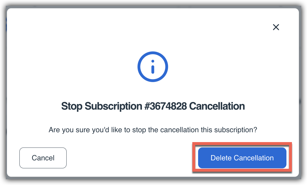 This will bring up a message asking you to confirm that you would like to stop the cancellation of the subscription. If you would like to proceed, click Delete Cancellation. This will remove the scheduled cancelling and the subscription will resume as normal!