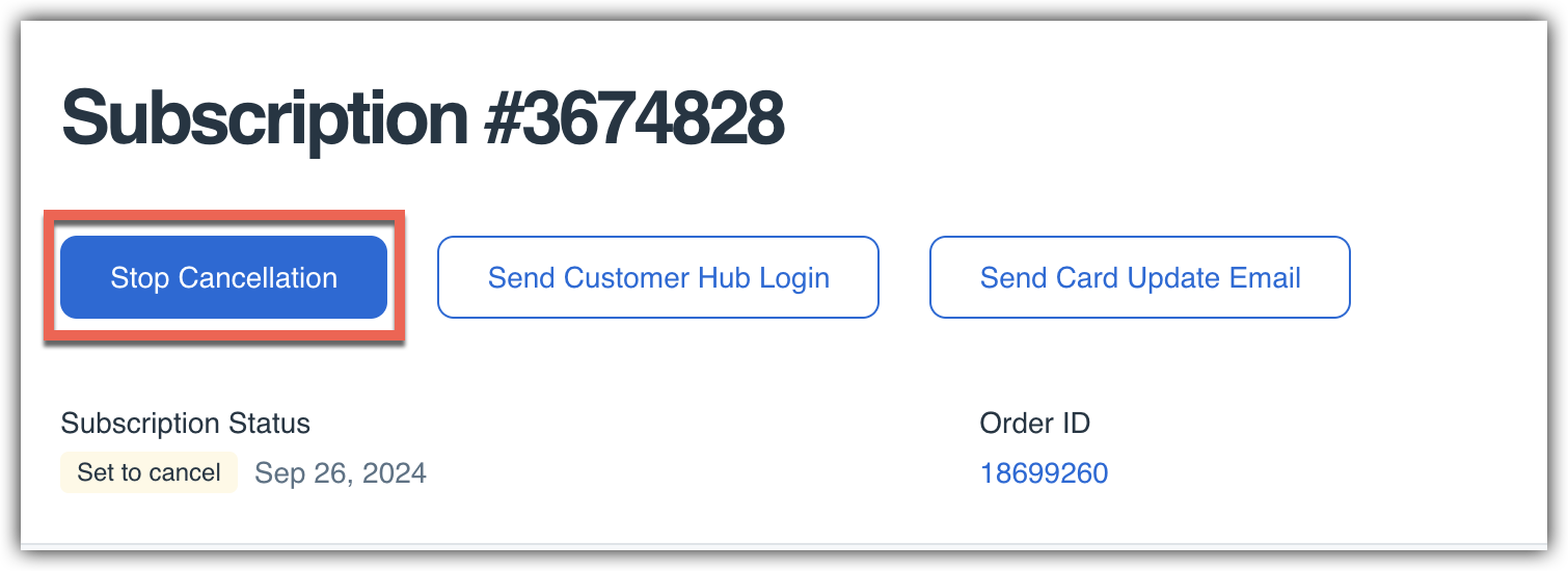 Just like you can schedule a cancellation from the quick actions or the specific subscription page, you can also stop the cancellation from either place! To get to the specific subscription page, click on the Subscriptions tab on your left hand navigation bar, and search for the subscription you would like to stop the scheduled cancellation for. Click on the subscription ID to go to that specific subscription's page - the button that was previously "Cancel Subscription" will now be Stop Cancellation.