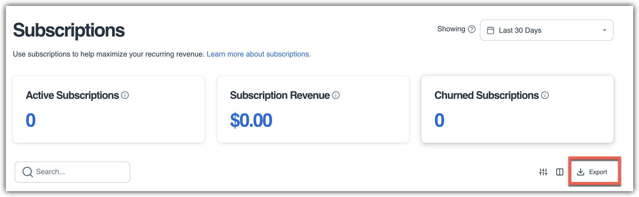You can export your Scheduled Cancellations report by clicking on the Export button right above the subscriptions table on the Subscriptions page. This will bring up a pop-up window where you can choose details about your export.