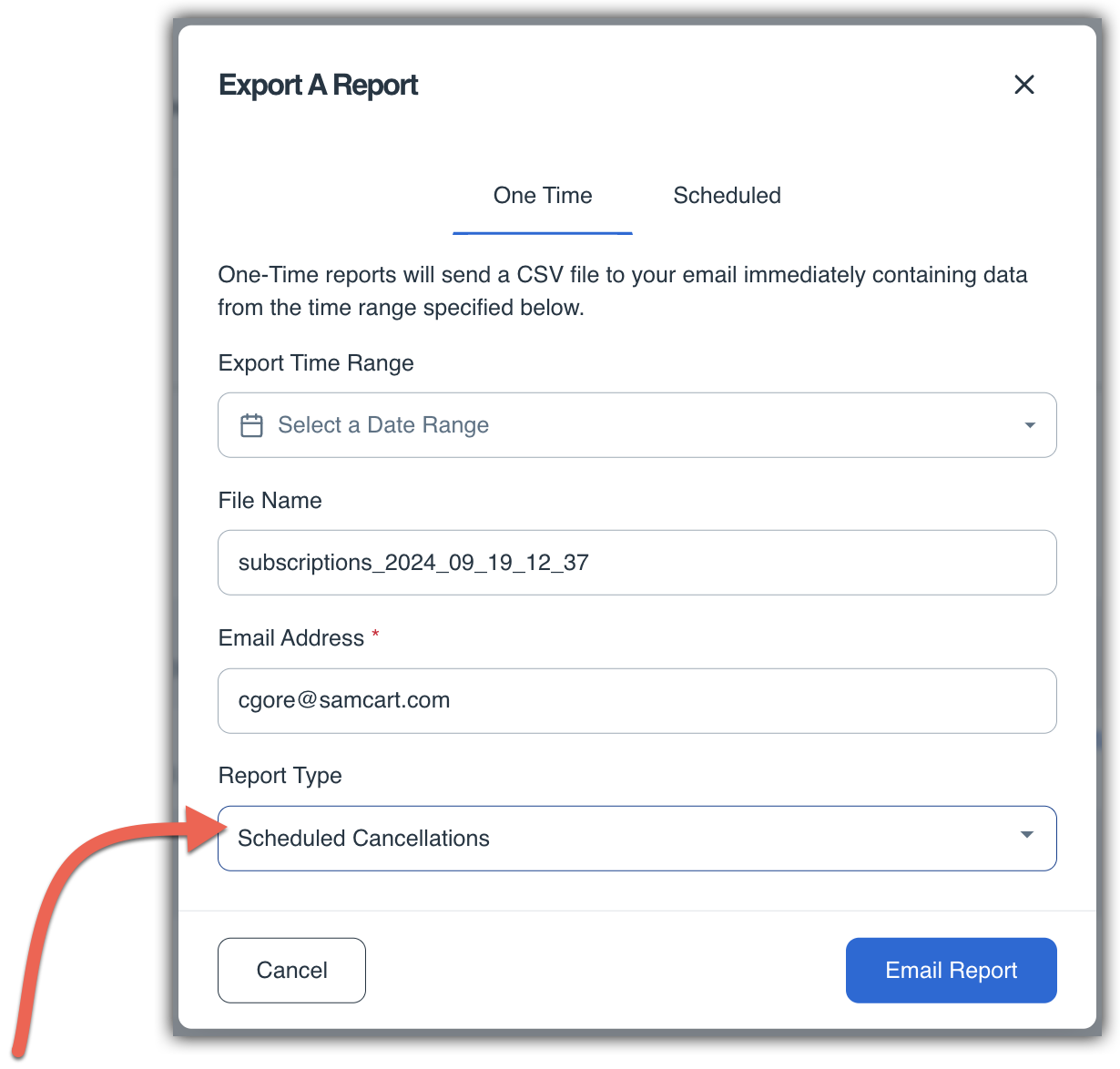 In the Export A Report pop-up window, you can choose the Export Time Range, File Name, Email Address for the report to be sent to, and a Report Type. To make sure that you are getting a report for scheduled cancellations, it is very important to make sure to change the Report Type to Scheduled Cancellations!