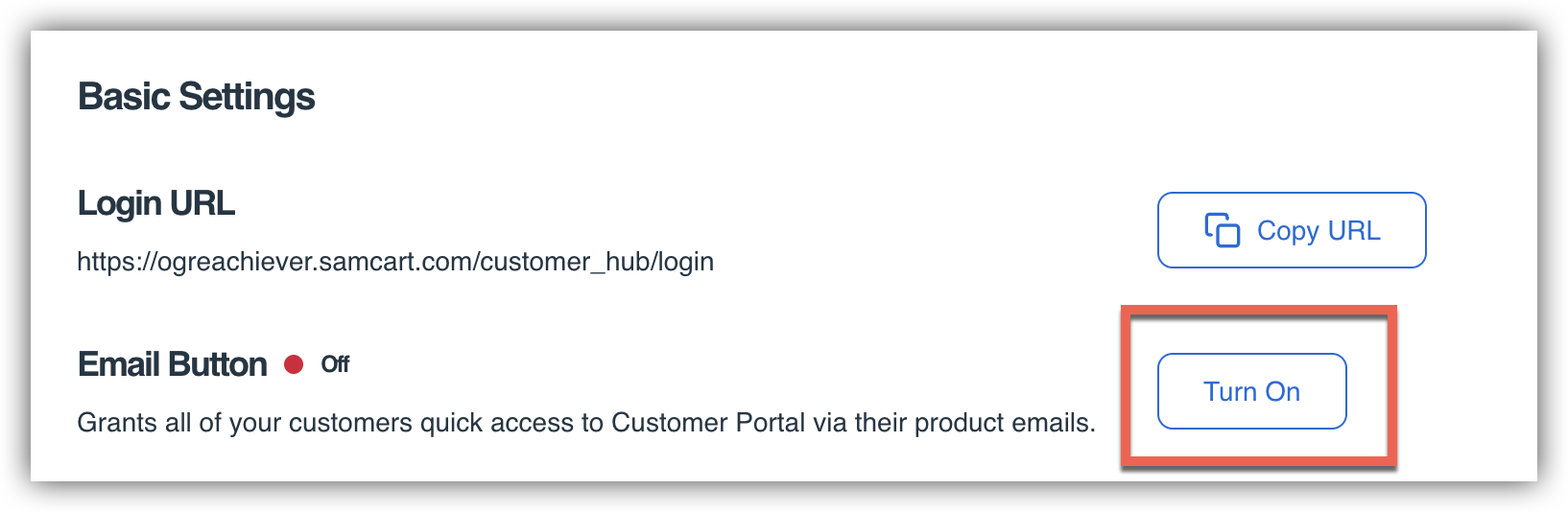 If you would like your customers to have the ability to cancel through their subscription charge reminder emails as well, within the Customer Portal settings locate the Email Button setting and click Turn On. This will grant all of your customers access to the Customer Portal through their Subscription Charge reminder emails!