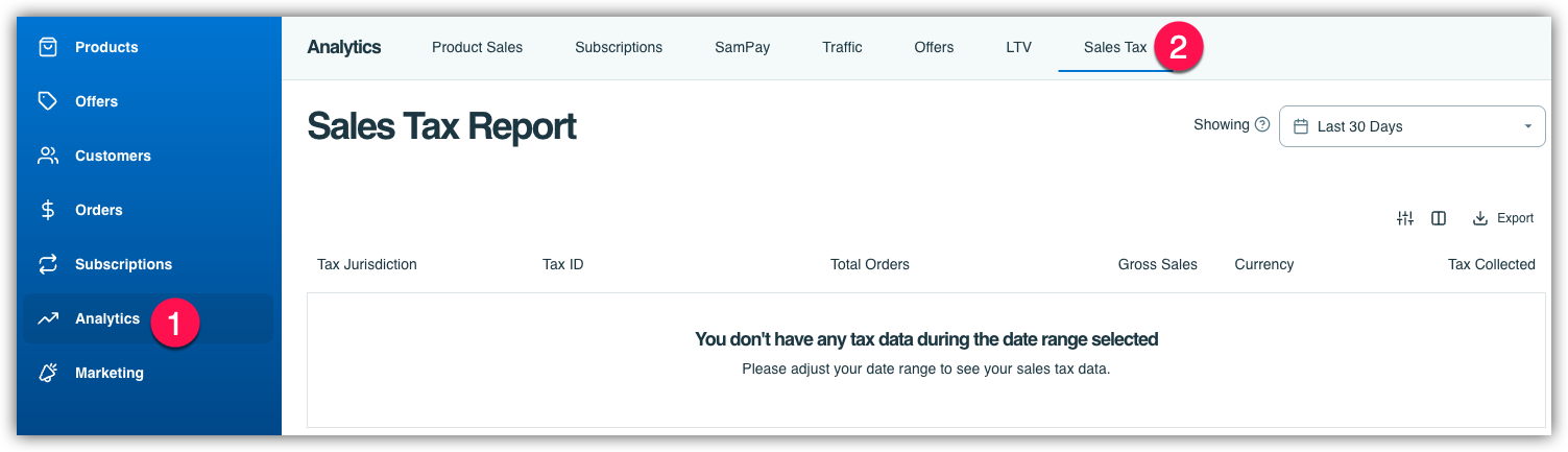 You can now view a report of all the sales tax you have collected directly within SamCart! You will be able to: