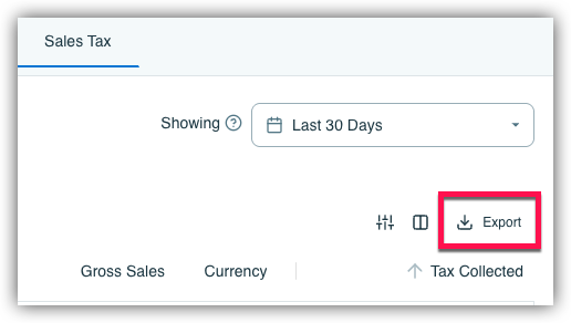 To export your Sales Tax Report, click Export to download your tax data as a CSV file.