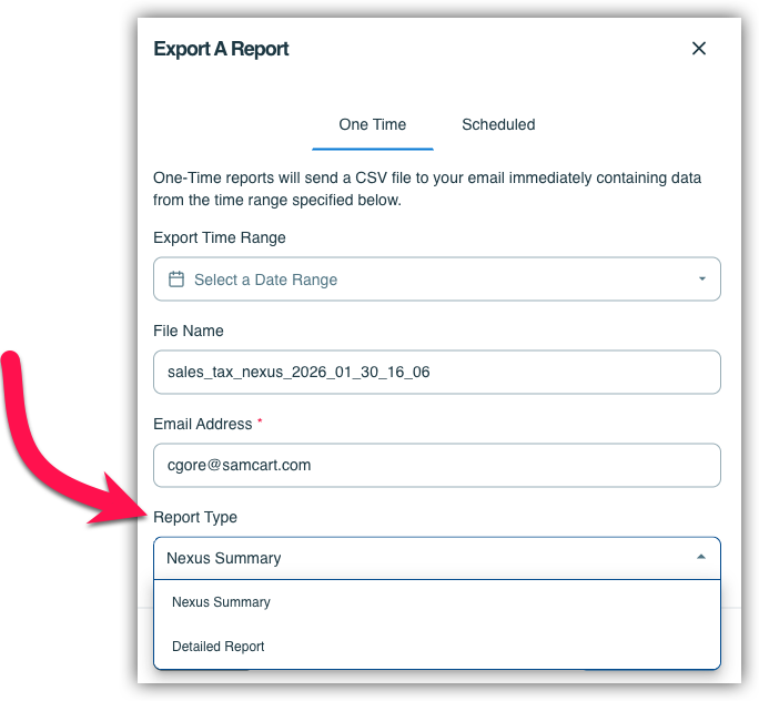 - Nexus Summary - A summary of tax collected per jurisdiction—the same data shown in the UI. Use this for quick tax filing or to see totals by state.