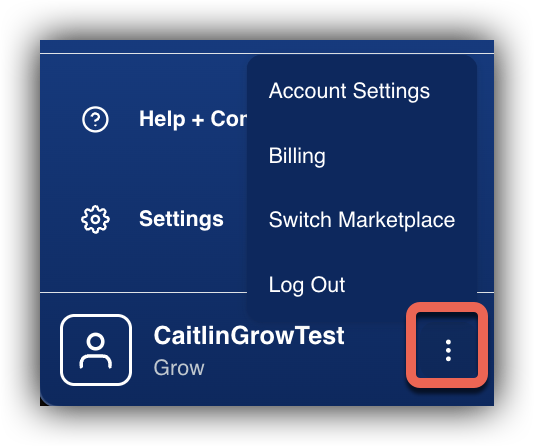 Clicking the icon in the top right corner of your marketplace (if you have a marketplace logo, this icon will be your logo) will bring up your Account Settings options. This is where you'll be able to manage your Account Settings and Billing information, as well as log out or switch marketplaces (if you have multiple marketplaces). For a deep dive into all of the features found within Account Settings we suggest reviewing this guide here.