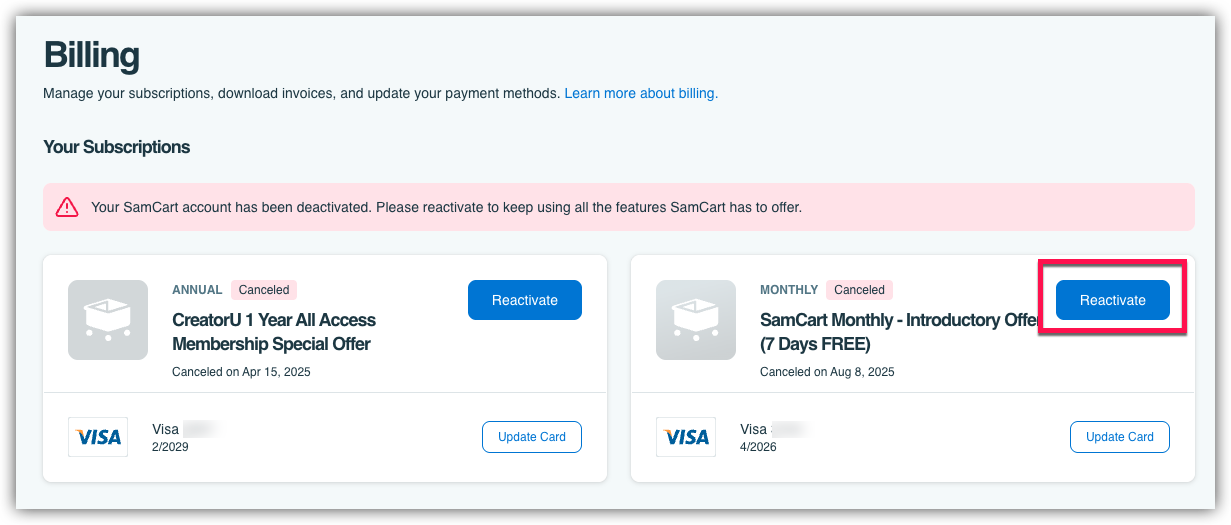 Once you have signed in, you will automatically be directed to your Billing page. Under the Your Subscriptions section, you will see your previous subscription history. From here, you can select the SamCart subscription you want to reactivate and click the blue Reactivate button!