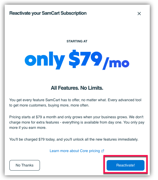 Clicking the Reactivate button will bring up a pop-up window will then appear which provides you with the full details of your subscription that is to be reactivated. You will see our current plan offering (the Core Plan), and be reactivated on our current plan at $79/mo! To read more about how our pricing works, visit our Pricing Page. Click the Reactivate button on this pop-up window to officially reactivate your account!