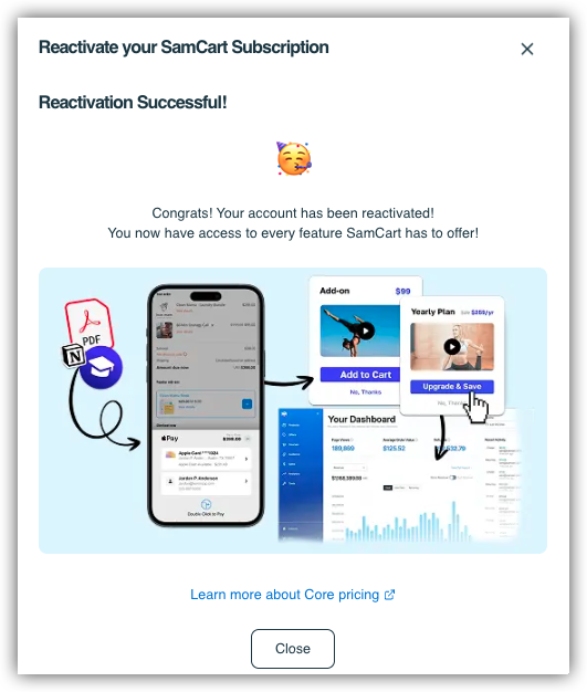 We are happy to help you get your account up and running again! You can now reactivate your SamCart subscription directly from within your existing SamCart marketplace.
