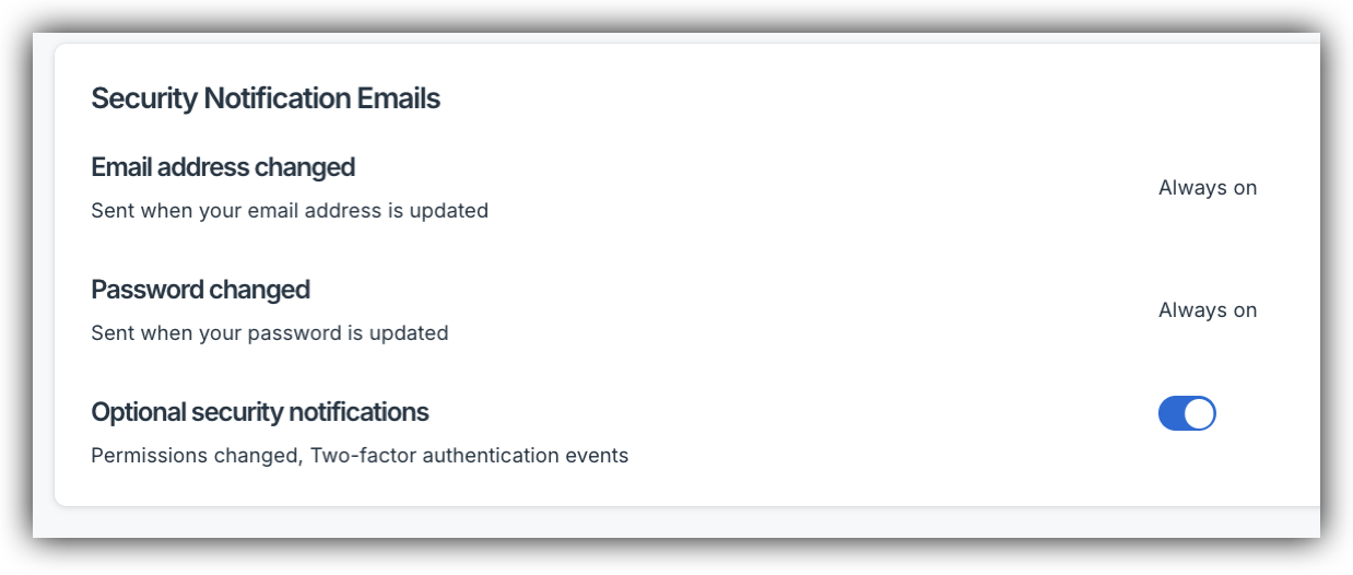 A: It depends on the notification type. Emails for email address changes and password changes are Always On and cannot be disabled — these exist to protect your account. Notifications for permissions changes, two-factor authentication events, and team member additions or removals are enabled by default but can be toggled off in Account Settings under Security Notification Emails.