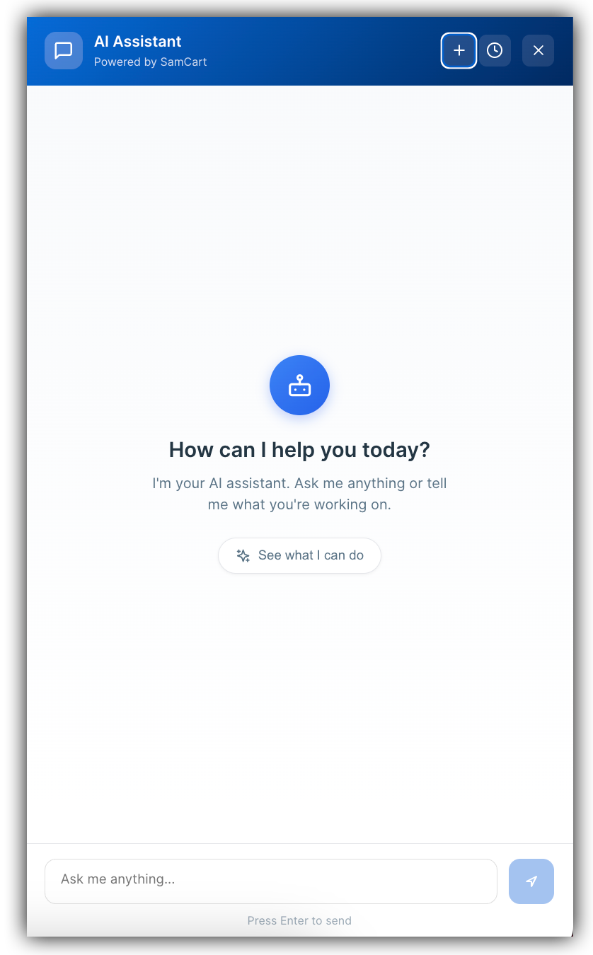 The SamCart AI Assistant now includes a live chat feature that allows you to get real-time answers to your support questions. Instead of waiting for a human agent, you can chat directly with the AI Assistant and receive instant responses to common questions and concerns. This feature is designed to provide fast, accurate, accessible support around the clock, helping you find the answers you need quickly and efficiently.