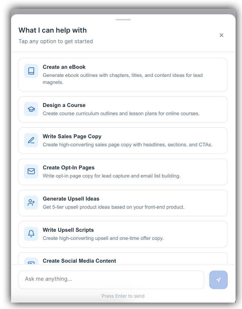 Introducing the all new CreatorAI Assistant! This brand new addition to your SamCart Marketplace is an AI Powered tool which allows creators to build, market and sell their products without switching between tools or recreating content across multiple platforms. The AI assistant understands context across products, suggesting complementary content, generating sales copy, that references course materials, and maintaining brand voice consistency across all touch points. The AI Assistant can help you Create an eBook, Generate a Sales Page or Social Media Content, and Generate Upsell Ideas and Scripts.